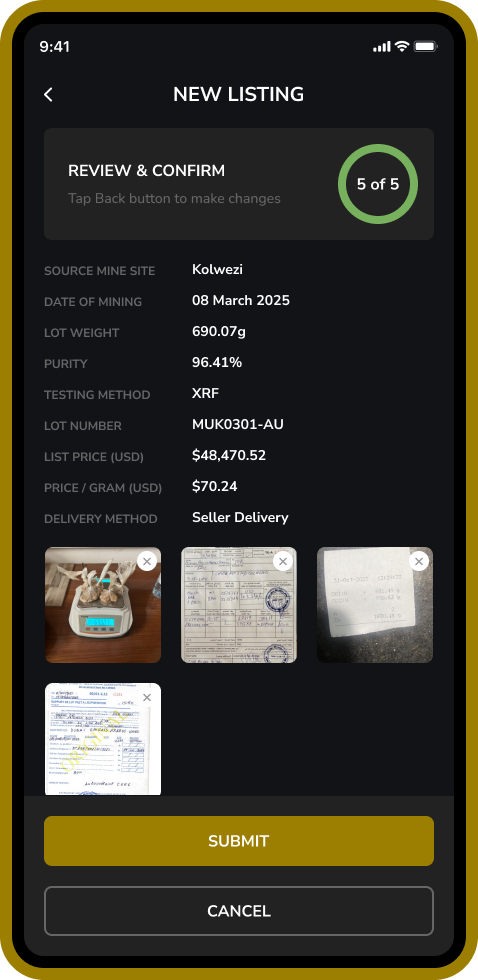 Create a Listing: By the time a producer reaches this screen, they’ve entered shipment data, uploaded documentation, selected delivery method, and confirmed Clean Gold status. The review screen makes the whole submission feel considered, not rushed. It gives the user one clear moment to verify before committing.