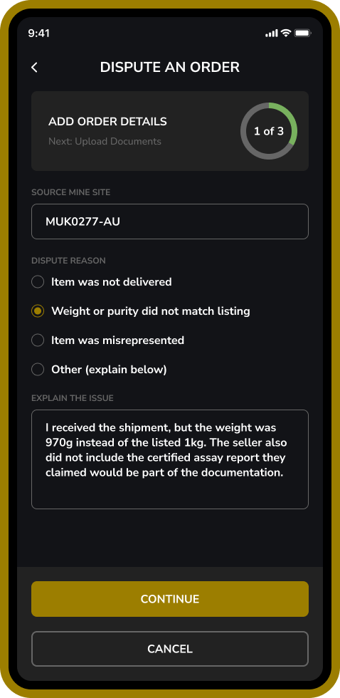 Order Dispute: Most products treat disputes as an afterthought. In a cross-border commodity marketplace, they’re a core use case. This screen gives exporters a structured path to file a dispute without it feeling adversarial. Designed to protect both parties and keep transactions moving toward resolution.