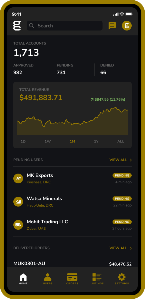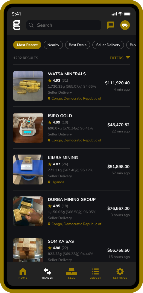 Marketplace Listings: The browse experience at the heart of the marketplace. This is where buyers shop available gold listings. The design borrows the familiarity of a consumer marketplace but layers in the signals that matter in commodity trading: trust tier, certification status, and available quantity.