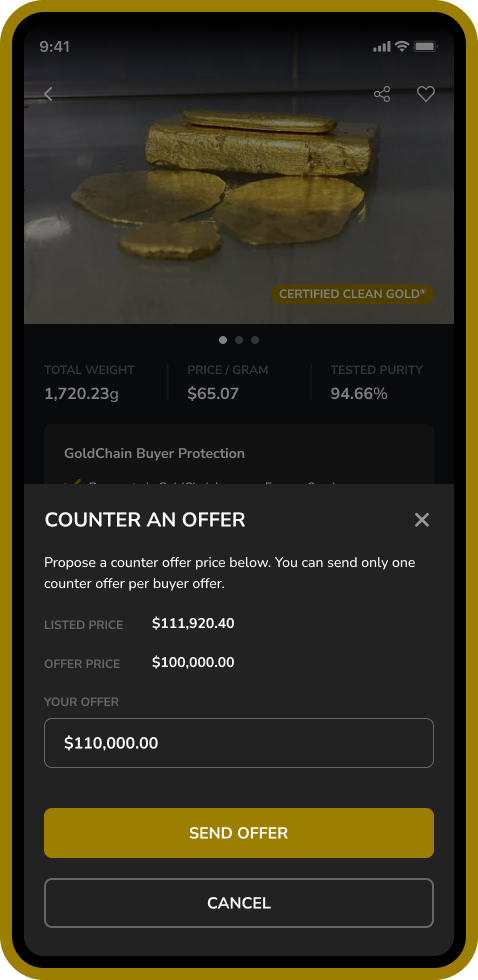 Offer Negotiation: This is the screen that makes GoldChain a marketplace and not just a tracker. Sellers can view incoming offers, counter, accept, or decline with the full listing context visible alongside the negotiation. The offer flow is designed so that every action is one tap, but nothing is irreversible without confirmation.